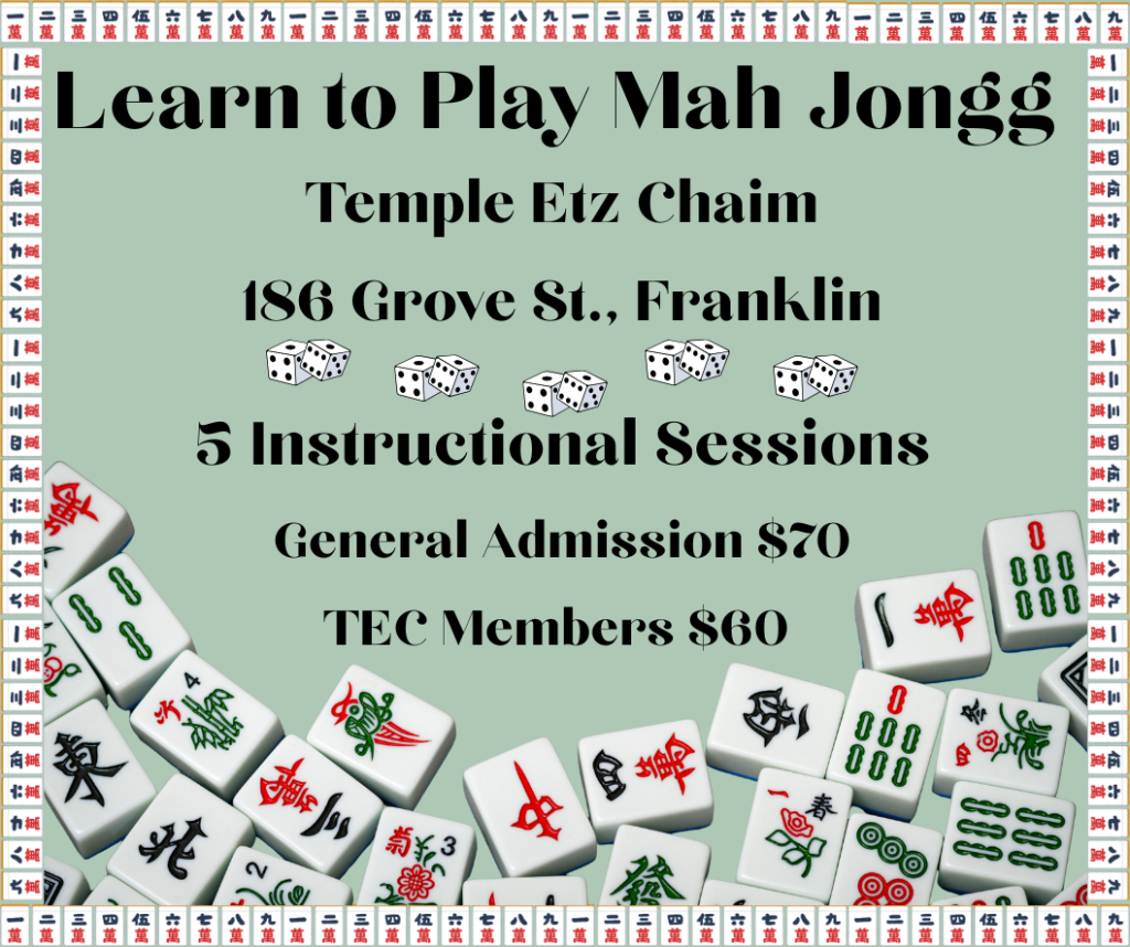 We invite you to participate in a five-day instructional program designed for beginners. The final session will be dedicated to practice play. Seating is limited. Participants will be given Mah Jongg cards to borrow for the duration of the course.
